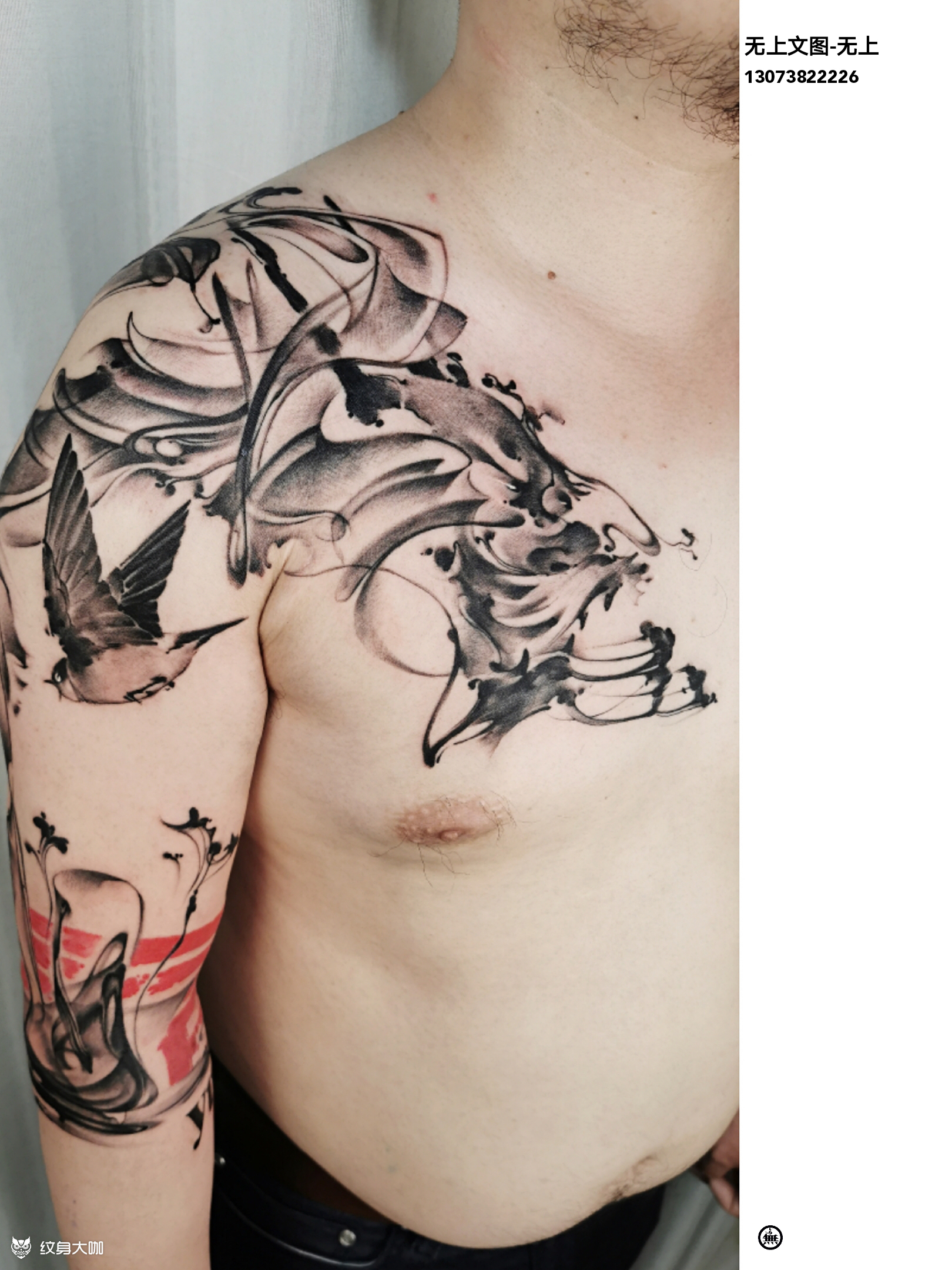 龙首之源 新中式水墨刺青半甲 【龙首之源】 無上 今日工作,客人是自远道而来,取其名字之中一字,设计水墨刺青半甲,饮水思源,我们都是龙的传人,源字用隶书与红色放在手臂下方,完成象形寓意,英文点缀让画面更加富有节奏感。从此处飘渺而上的青烟,万物生发,从无到有,凝烟成像,神龙见首。雀翎舞动,展翅高飞,是对生活最为美好的期许,也是客人对自己的一种祝福。新中式水墨刺青打造你的私人订制。 无上文图出品