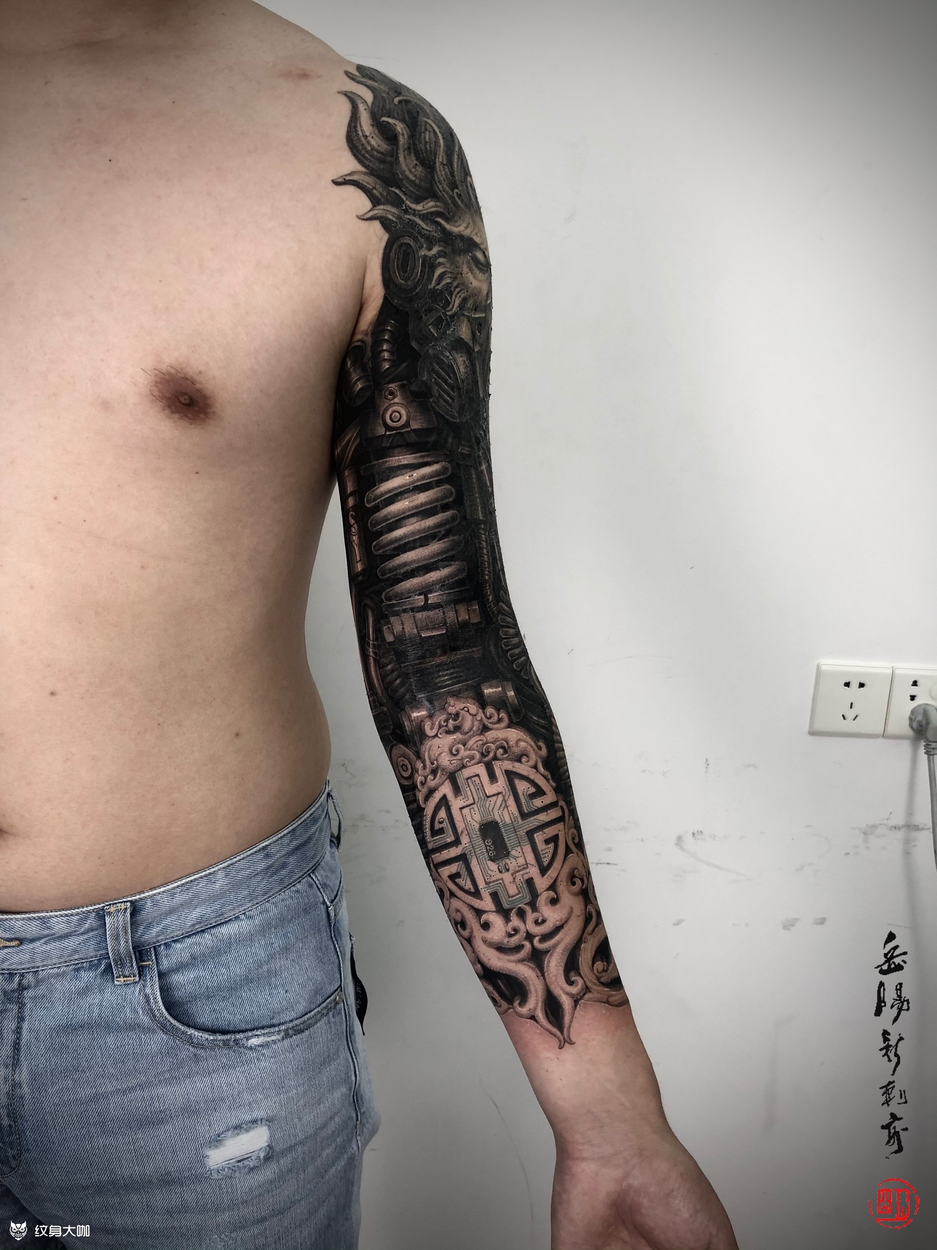 阿明作品 阿明作品,耗时70小时。承载者从事IT行业,不想做的太靠下怕以后一些工作场合不好遮挡,所以设计了九分袖。 要求赛博朋克风格,想要悟空,原因是他姓孙[憨笑]。其他元素想要避震、涡轮、cpu,还想要一些跟财有关的题材与设计,这也是很多人喜欢加入的元素,不过机械这方面相关的元素阿明只想到了取款机和POS机,还有女收银员,这些都不太适合,最后联想到悟空属于传统题材,所以找到咱们老祖宗的传统财字图纹,再搭配